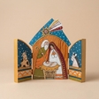 A hand-painted wooden nativity scene in triptych form — folds open to reveal the birth of Christ flanked by animals, set against deep teal panels with folk ornament. Ukrainian folk-art style.